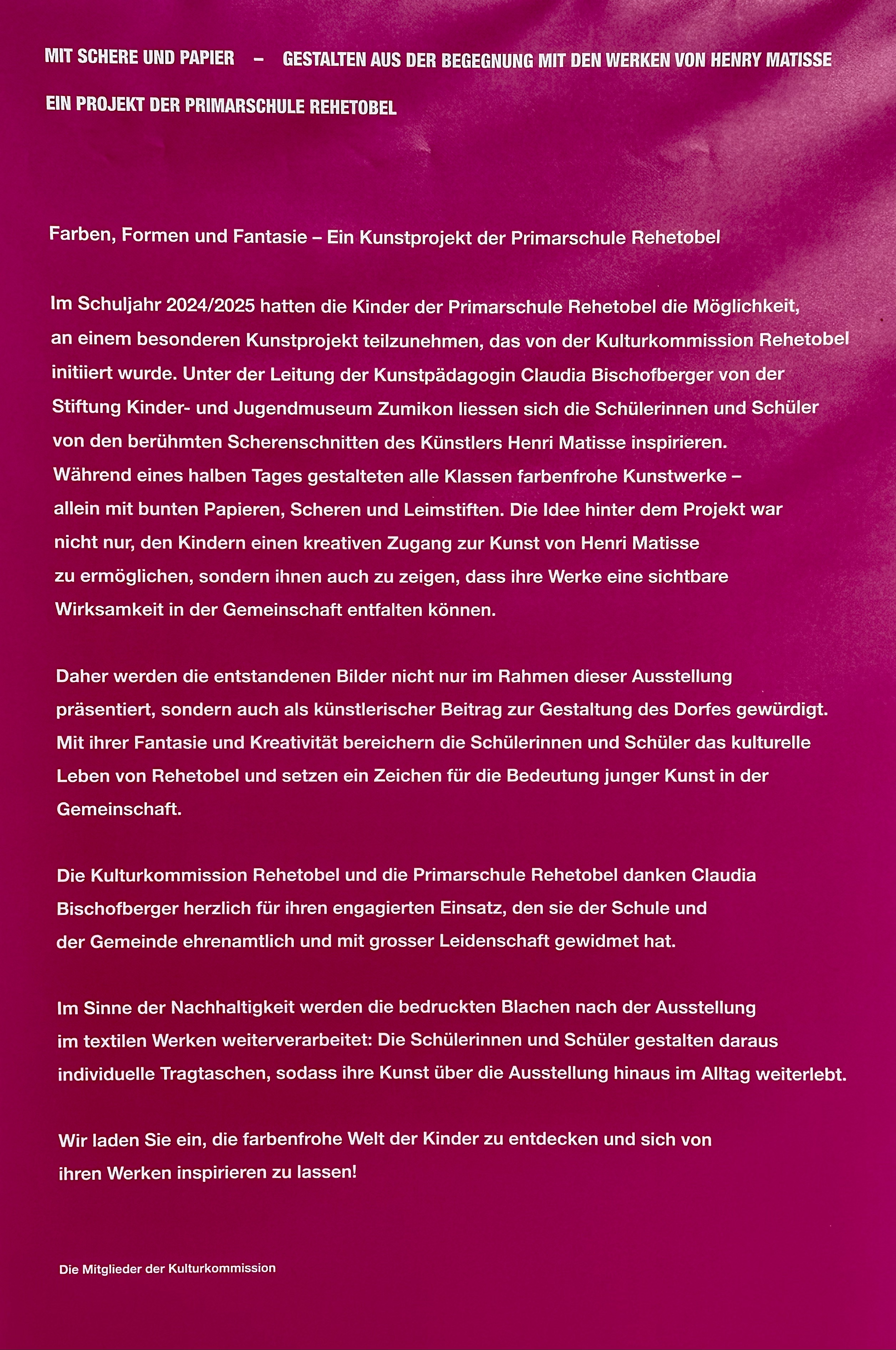 Farben, Formen und Fantasie – Ein Kunstprojekt der Primarschule Rehetobel, der Kulturkommission Rehetobel in Zusammenarbeit mit kijumu.Die Ausstellung und Wertschätzung der Kinderwerke ist bis im Herbst 2025 im Dorf Rehetobel zu sehen.